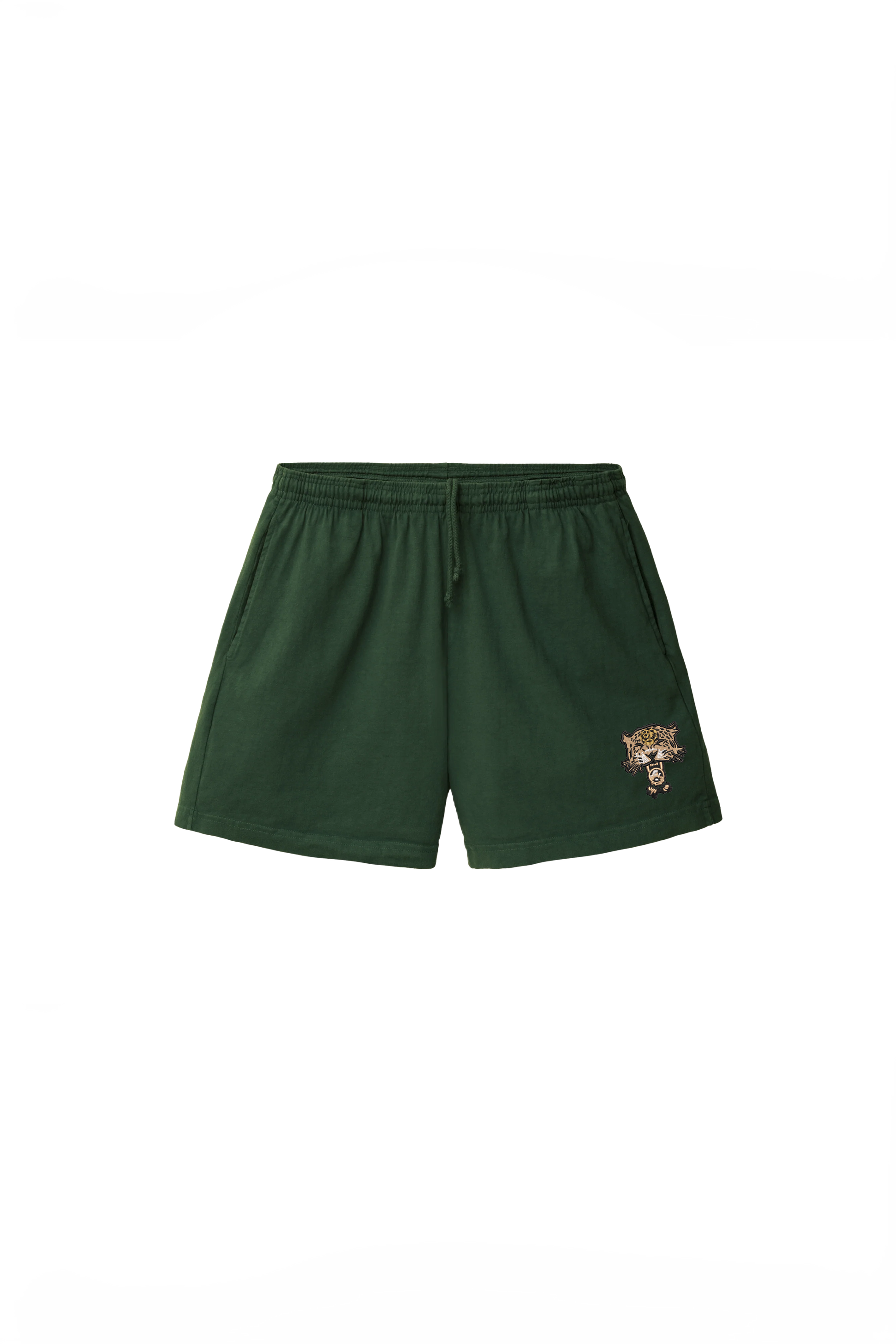 Made in USA. 100% cotton with embroidered logo on bottom left leg of garment dyed gym shorts. Does not shrink after wash.